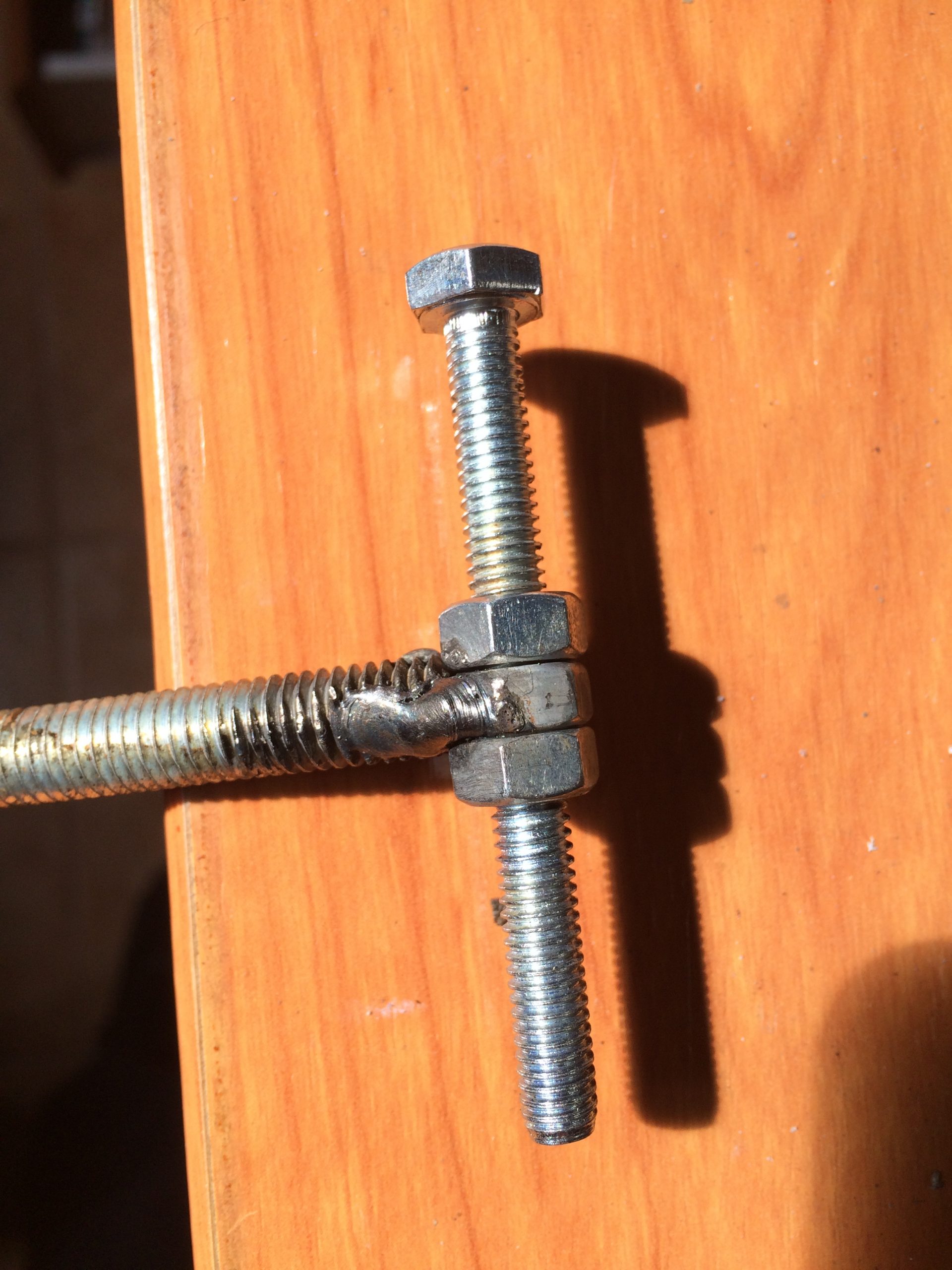 El eje central del freno, construido con una barra roscada a la que le soldé 3 tuercas, me permitía así ‘engranarla’ con la base, permitiendo un leve pivotaje, alma de todo el asunto.