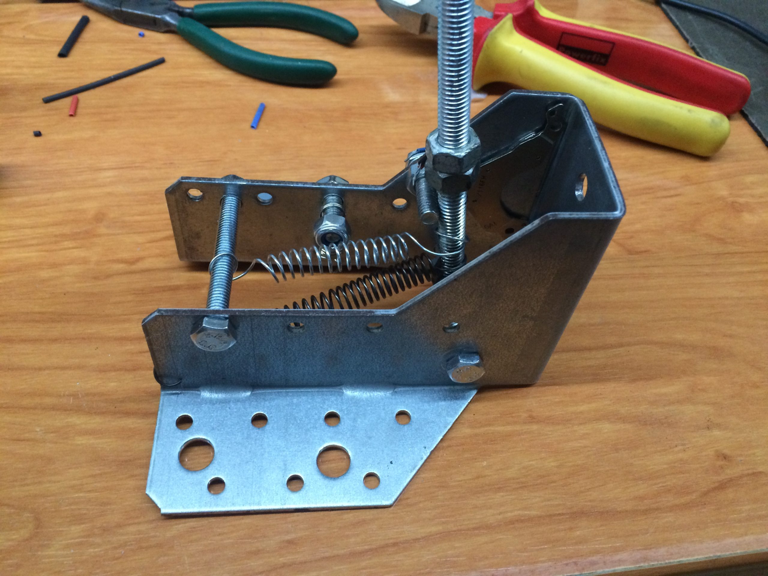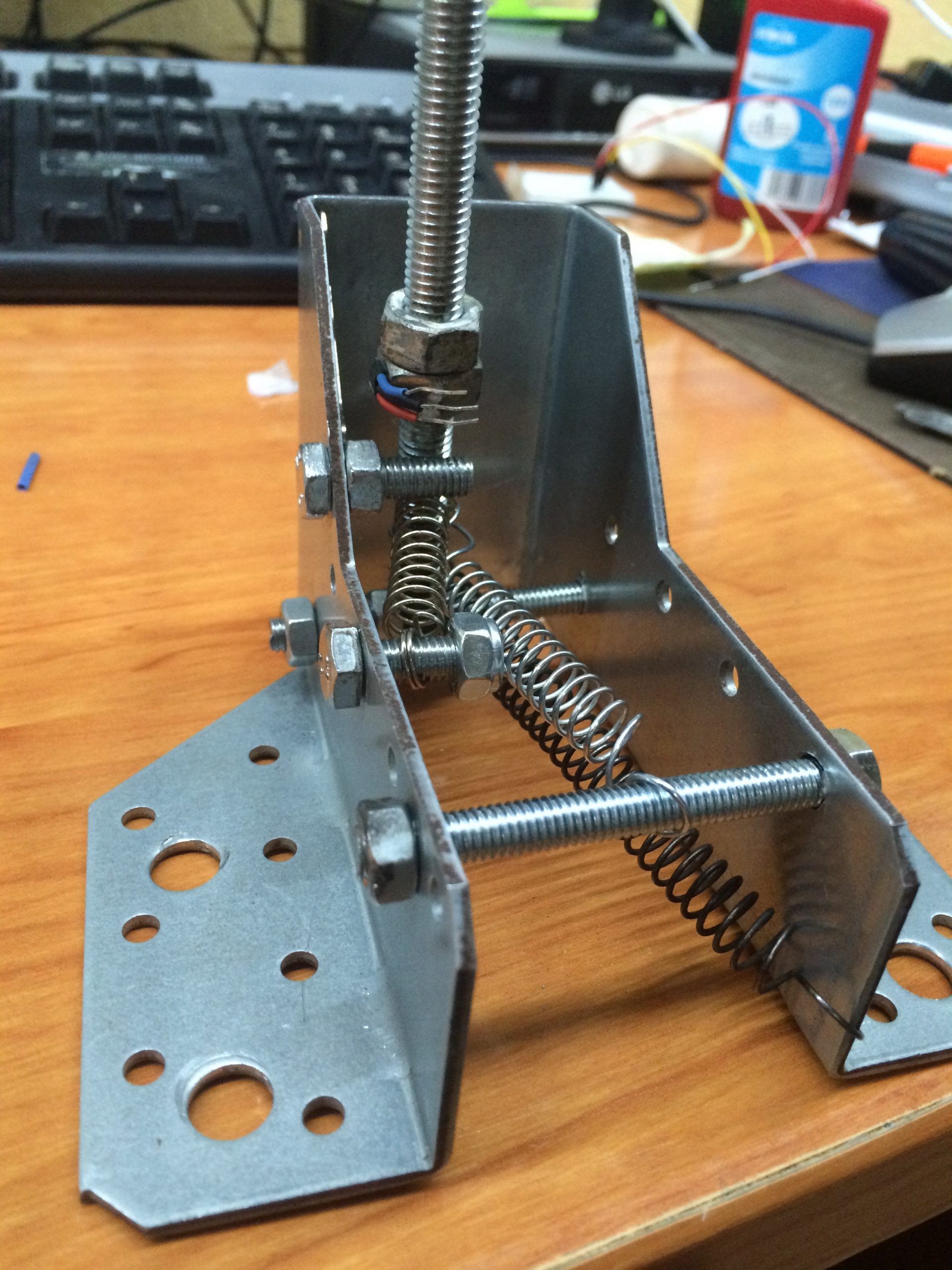 La parte mecánica se compone de un soporte de acero accesible encualquier tienda de bricolage. Utilizando sus agujeros fui intercalando tornillos para que hicieran de tope y dieran cuerpo al conjunto, a la par que permitían alojar diferentes muelles para el eje principal del freno de mano volviera  a su posición inicial.