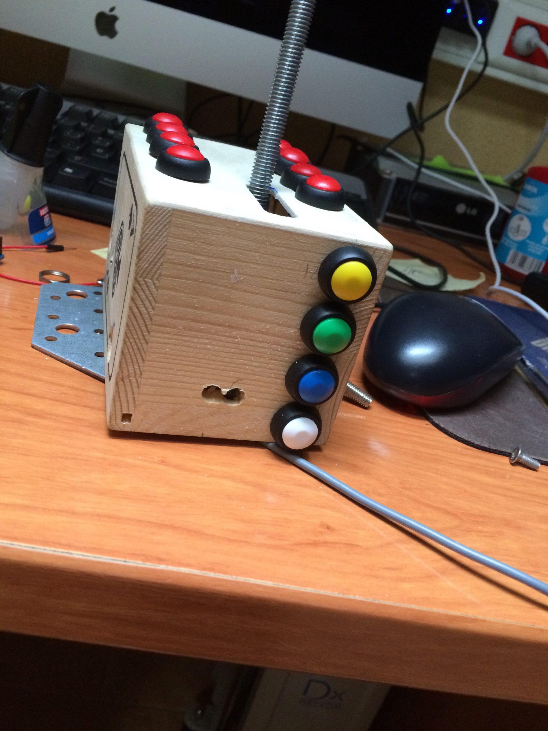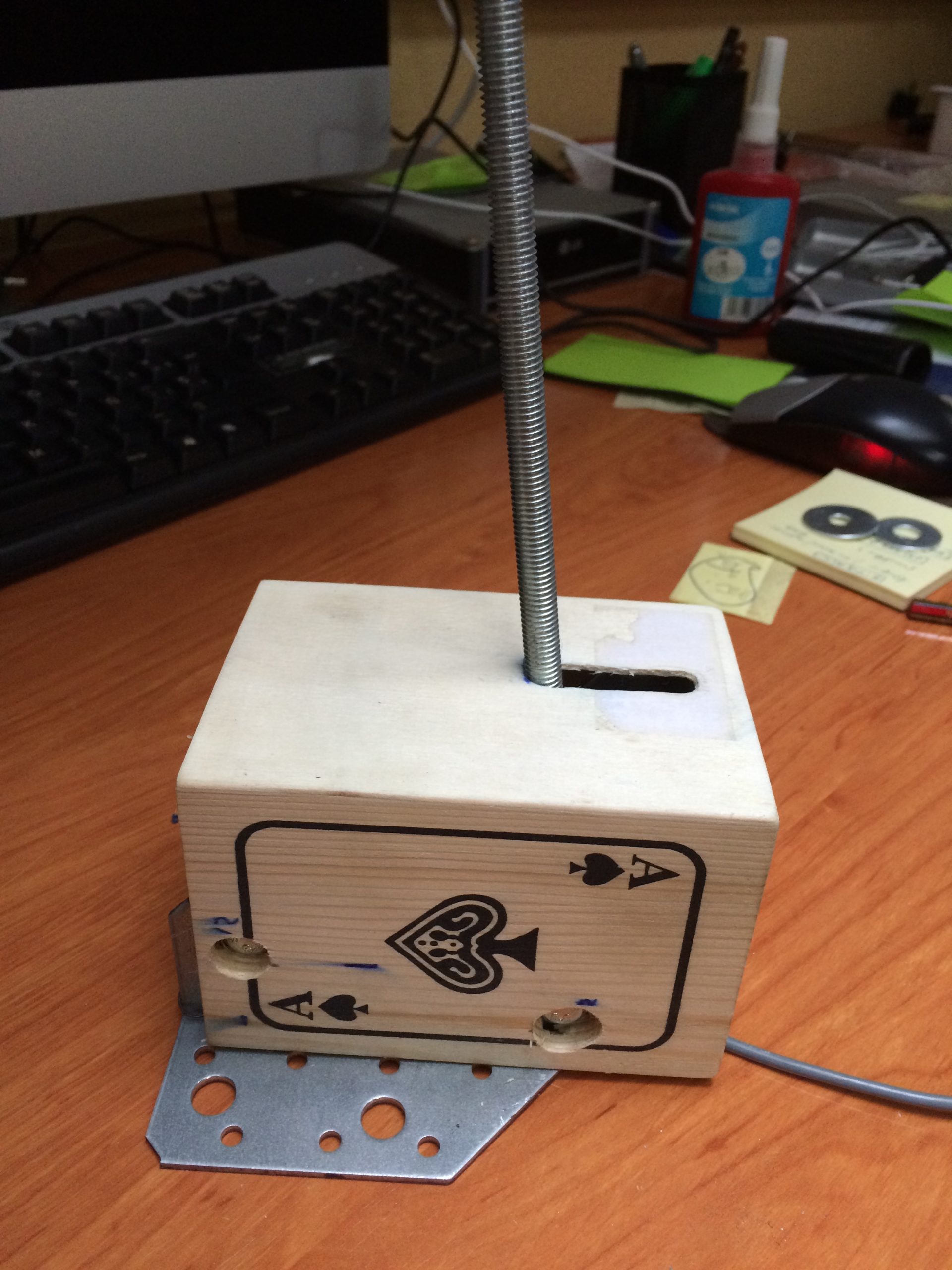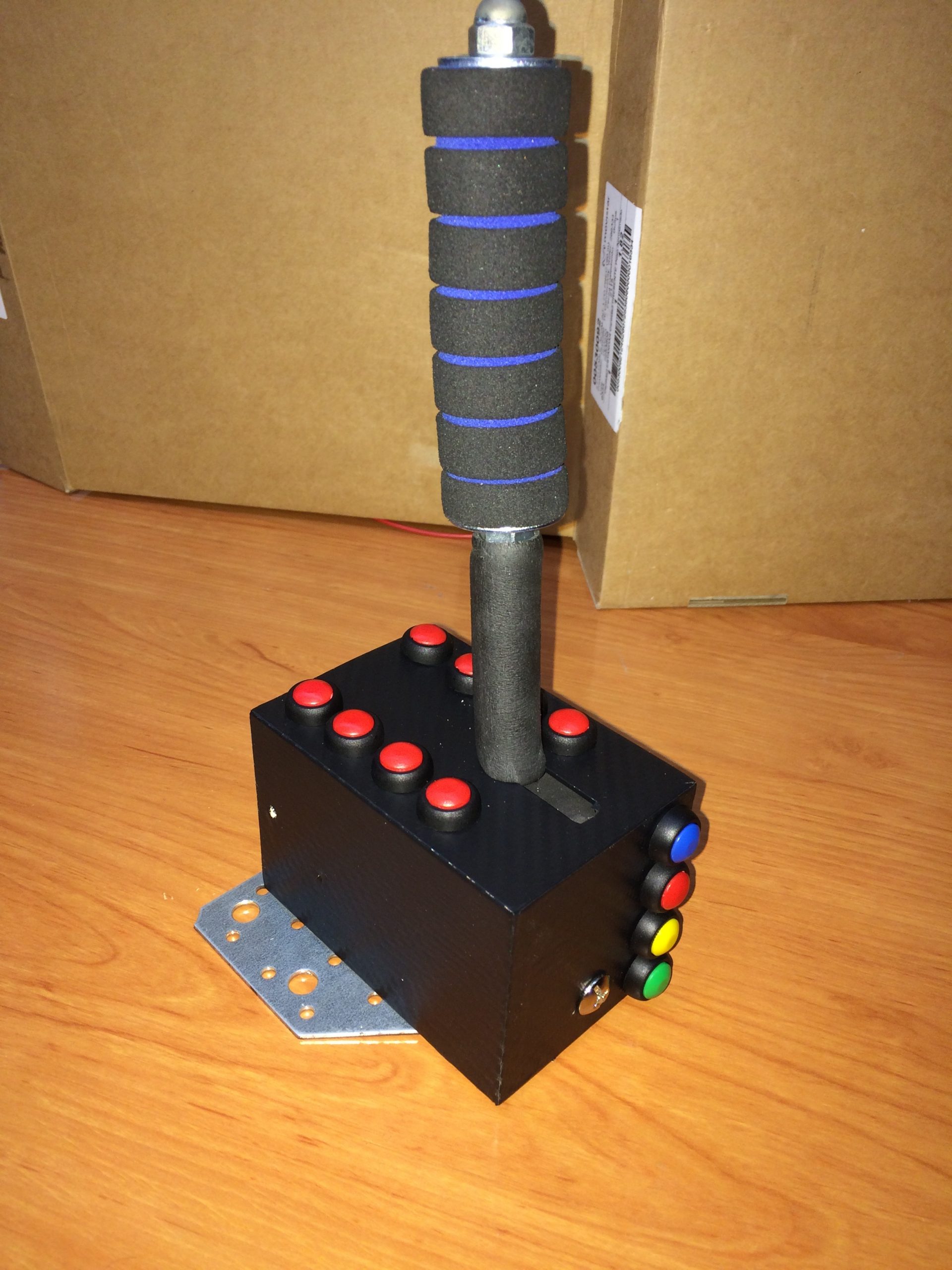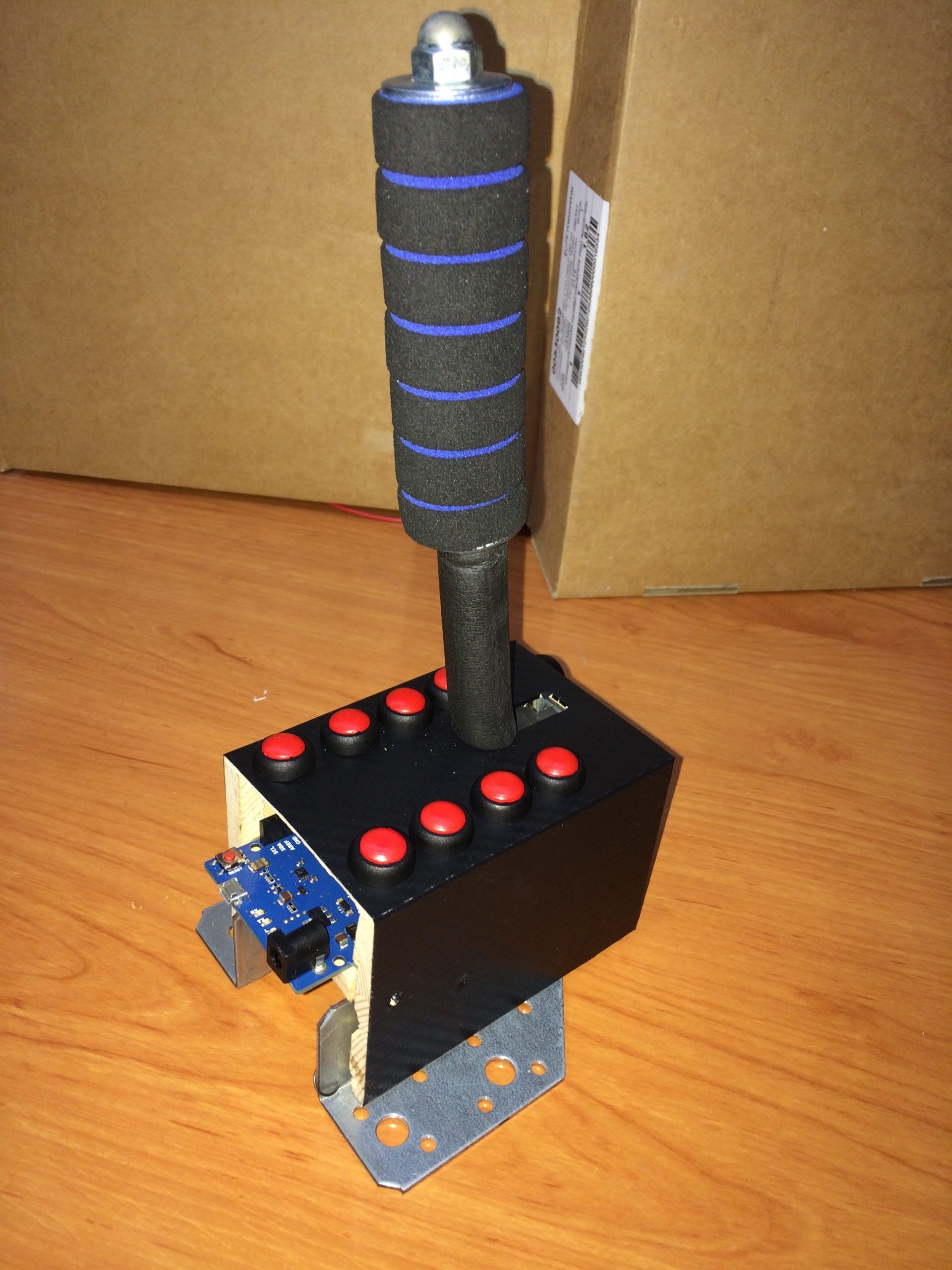 Para encapsular todo el conjunto adapté una cajita de barajas que venden en los chinos, realizando los orificios necesarios para albergar los botones y permitir el movimiento completo del eje del freno de mano.