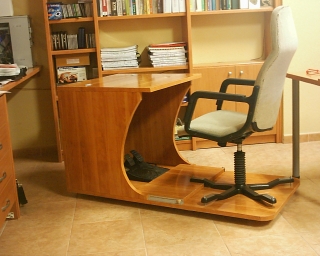 La madera se forró con adhesivo ironfix de color negro y azul para lograr una decoración yaspecto más de cockpit de conducción que de mueble de oficina.