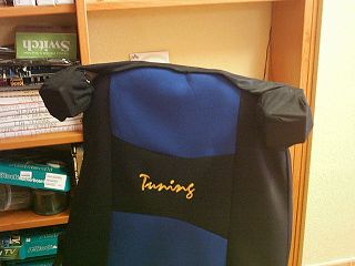 Inicialmente se colocó un viejo sillón de ordenador como asiento, al que eliminé las ruedas y lo fijé al suelo de la máquina para que no se desplazara hacia atrás cuando se presionaran los pedales. Se forró con una funda de asiento de coche deportivo para darle un aspecto más acorde a la función.